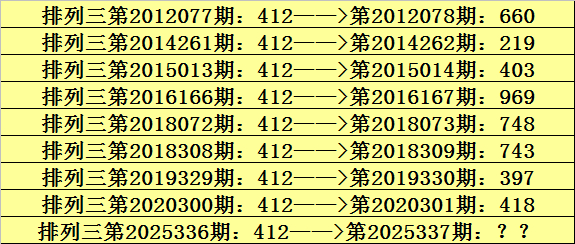 第2025336期陈设三奖号为412,历史上该号码直选出现9次,下期奖号分袂为:660、219、403、969、748、743、397、418。