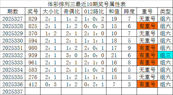 体彩枚举三最近10期区别开出奖号:829、825、370、594、980、939、961、583、276、412,各奖号属性详见下表: