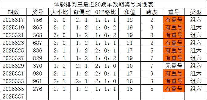 体彩枚举三最近20期单数期奖号区别为:756、865、568、687、836、829、370、980、961、276,各期奖号详备属性下表: