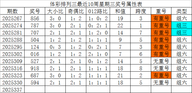 体彩枚举三最近10周星期三奖号区别为:856、787、707、504、124、016、527、918、687、594,各奖号属性详见下表: