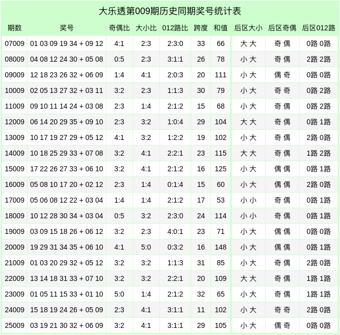 前区大小比:历史同时前区大小比为52:43,大数前区推崇较热,最近5年同时前区大小比为15:10,大数前区推崇较热;昨年同时前区大小比为4:1,本年预测大数前区数目占优,预测大小比为4:1。